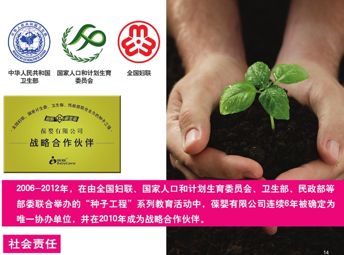 葆婴公司于1998年进入中国,至今已在中国投资一亿四千万元。从成立之初,葆婴就确定了以母婴和家庭营养健康事业为发展方向。葆婴进入中国十几年来,在23个大型城市设立了分公司,在北京经理技术开发区拥有符合GMP规范的保健品生产厂,已有上百万个家庭受益。为家庭提供纯净安全的营养保健食品和科学营养资讯是葆婴的一贯追求。
