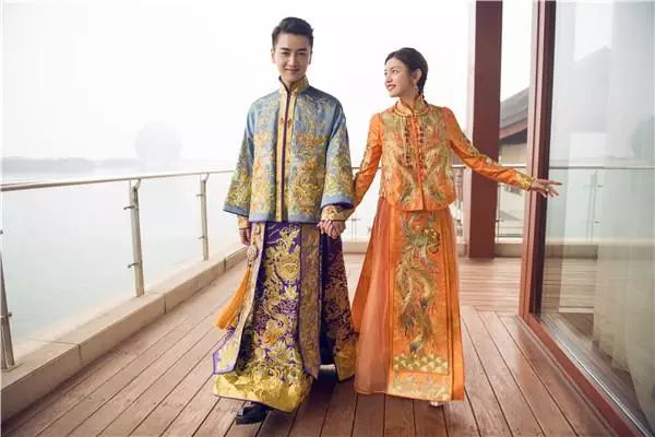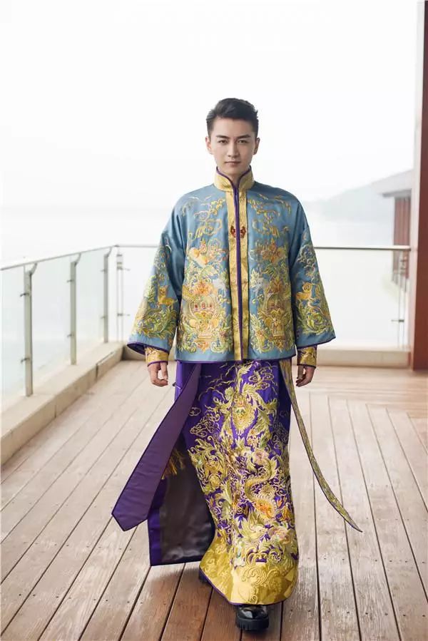 陈晓身着瑞兽紫金袍的结婚服,绣瑞兽龙纹刺绣,象征麒麟送子。(恩没穿子就来了)