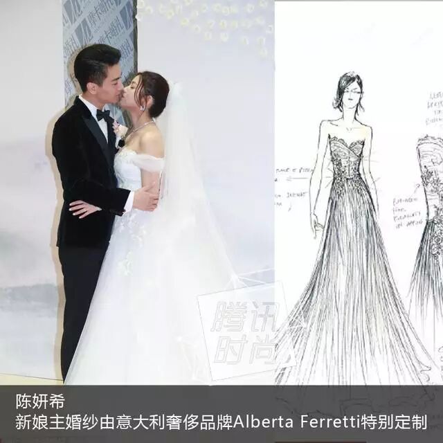 陈晓西式礼服来自Dolce&Gabbana,陈妍希主婚纱则由意大利奢侈品牌Alberta Ferretti特别定制。