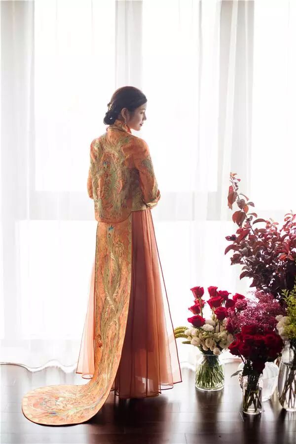 姑姑的橘色凤彩裙褂结婚礼服,金绣凤纹刺绣,精美华丽,佩上周大福故宫文化珠宝“富佑双喜”系列,贵而不俗。