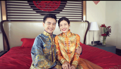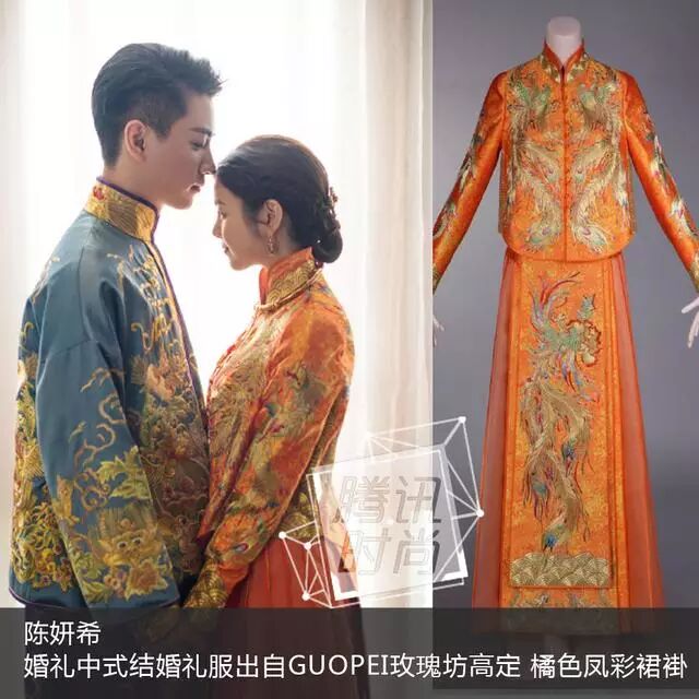 双陈这对“广受好评”的中式礼服来自本土设计师郭培,玫瑰坊高级时装定制。