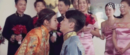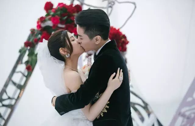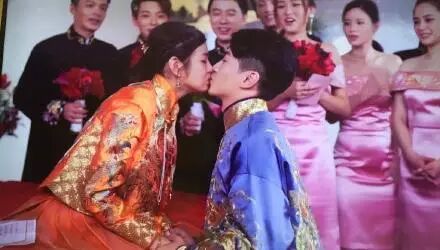 刚刚说完誓言的两人就自然地吻到了一起,主持人只好残忍打断:“还没到这个环节呢!”