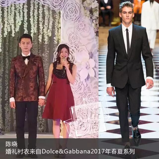 后来晚会祝酒服则走了西式贵族风,D&G的衬衫+Jimmychoo的鞋,鹅觉得他俩切蛋糕像舞剑。