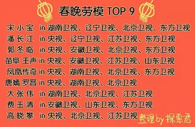 李宇春、凤凰传奇、蔡国庆、费玉清、潘长江、贾玲、郭冬临、宋小宝、柳岩等。