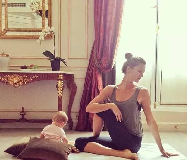 许多大牌奢侈品的超模广告宠儿——吉赛尔·邦辰,她就连在家带孩子也不耽误练习哦!↓