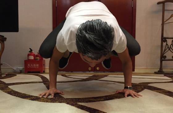 2.吸气,伸臂抬起身体,直至两臂完全伸直为止。