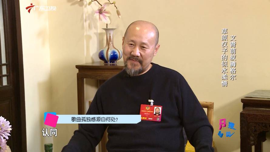 腾格尔:认同,这可能就是我的那个创作风格 跟我的那个童年的感受,有关系。因为我小时候,基本上是跟我的那个姥姥在一起长大。小时候比较孤独,特别是内蒙古那个在我童年的时候,人特别少,这样的话,我跟我姥姥在草原上,有时候一个月见不到一个人。我那时候也就是个,五六岁吧。那就没人怎么办呢?我一个人也不敢待,姥姥早晨起来放牧,我就跟着去放牧,她睡觉我也睡觉,她起来我也起来,回想起来的话,我的童年,我的脑海里出现这么一种,一个老太太,一个小孩就跟在老太太屁股后面,就一直屁颠屁颠那么一种感觉。童年的感受会影响一个人今后的发展,所以后来我成为一个创作者的时候,可能有童年的影子。人们说我的歌声有一种伤感的话,倒不如说有一种孤独感。