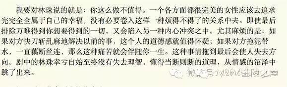 给小三抽身的原因是“不值得”,婚外情发生时,不管男人是及时换人还是拖着不换人,都是痛苦的,条件如此好的女性没必要纠结在这种男人里。最后还表扬了里林珠始终没失去理智(注意这个表扬是纯从第三者本人的立场出发的)