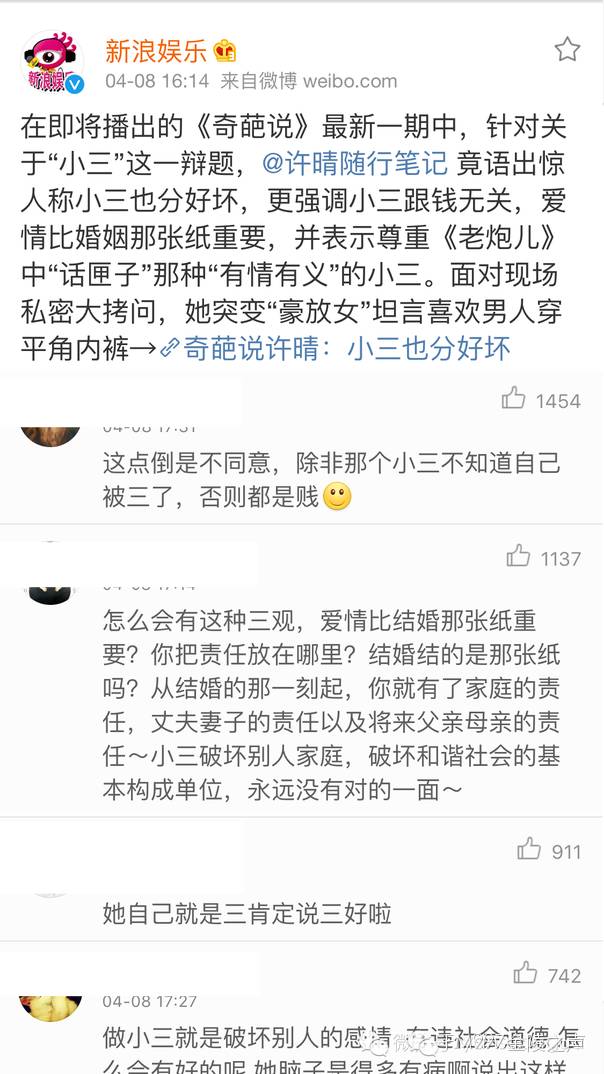 她说:“如果是好小三呢,我会劝闺蜜放开她老公;如果是坏小三,那我会跟闺蜜去找她的老公,不会找小三。”然后,评论就炸了……