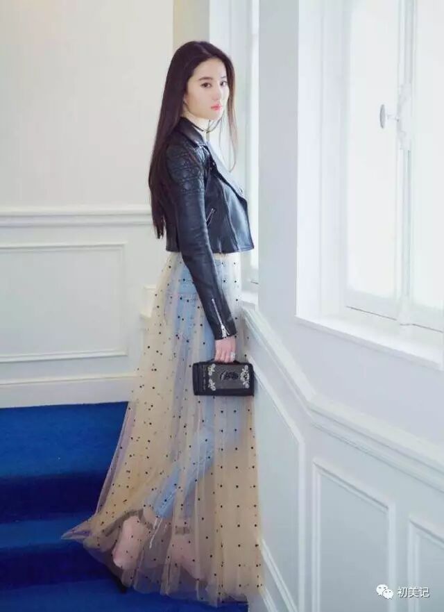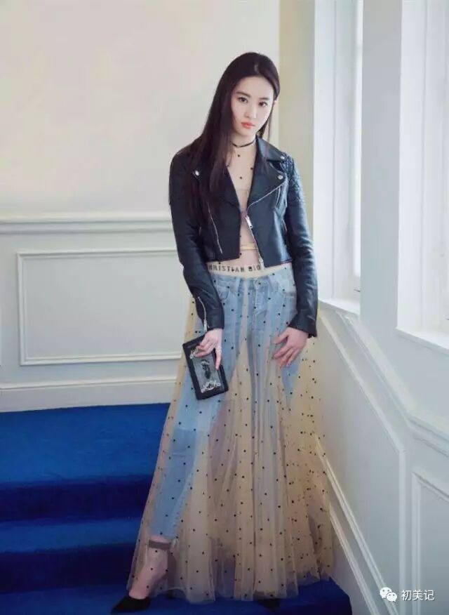 刘亦菲则是在外套上运用了黑色皮衣,肉色裹胸+蓝色紧身牛仔裤。