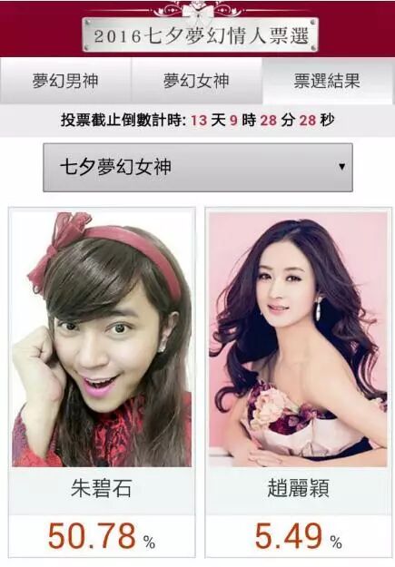 去年七夕梦幻情人投票,看看朱碧石和赵丽颖的投票就知道,完全碾压其他女艺人