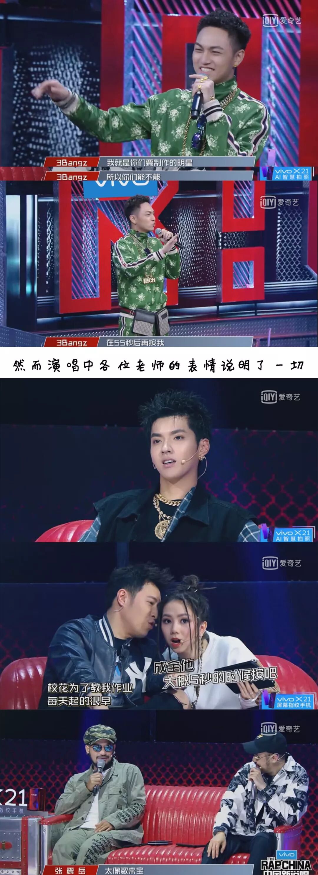 当时的表演现场是这样的,一个自称是喜剧说唱的rapper在上台之后要求评委在55秒之后才能按他,但是因为这个小朋友的说唱功底不够扎实,说唱风格太过于“幼稚”,于是张震岳评论了一句太像数来宝。