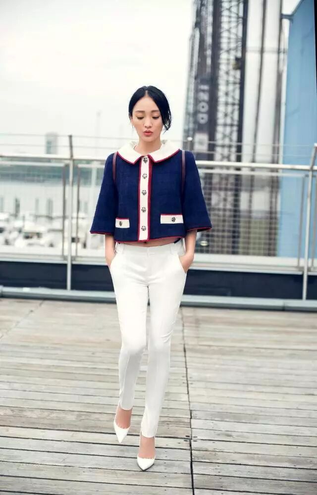 典雅的拼色翻领喇叭中袖短上衣,搭配白裤和白色尖头高跟鞋,优雅随性。