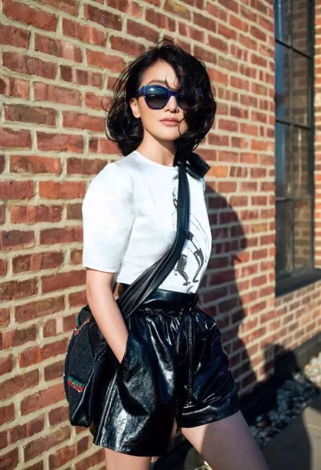 周迅蓝色T提亮肤色,复古眼镜潮范儿十足,搭配大牌经典款包包,让人难以忽视的气质。