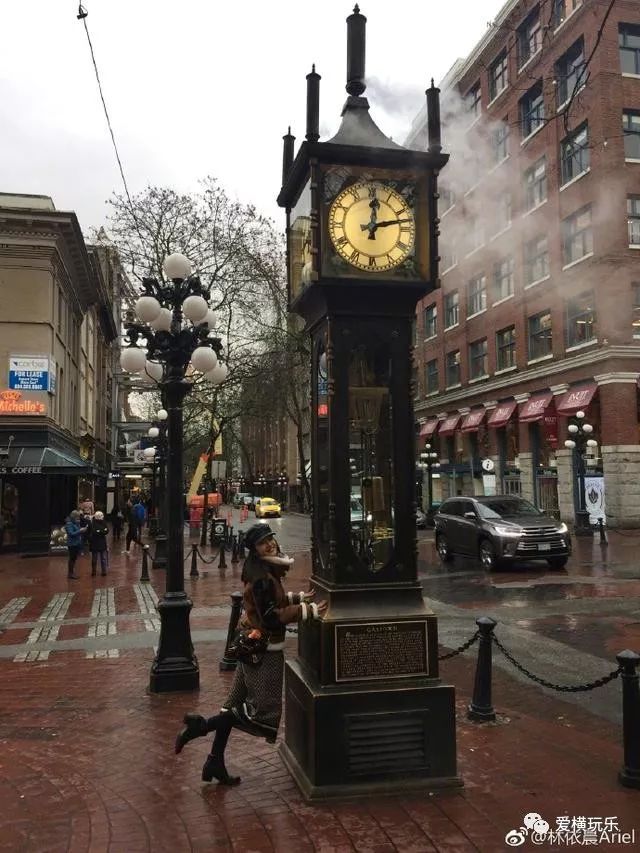 照片中的她,素颜出镜,与好友逛了当地的手工艺品,走过世界上现存最长的吊桥、在世界上僅存唯二的蒸汽鐘拍照……