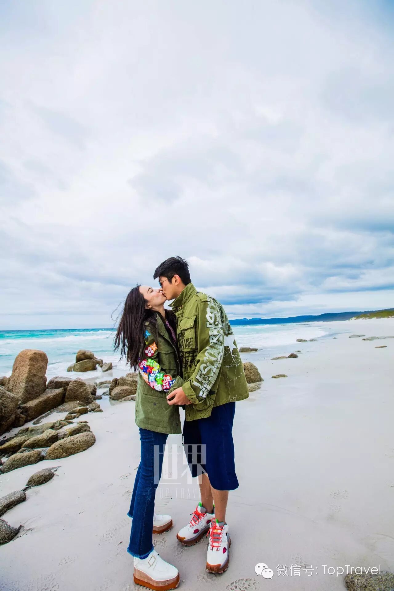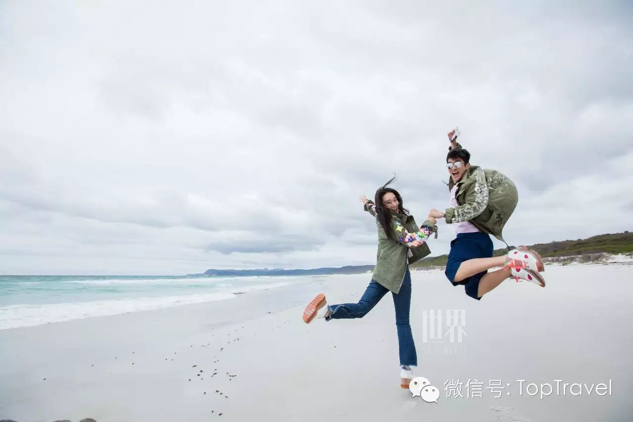 △在菲瑟涅国家公园的Friendly Beach,这对活宝夫妻面对碧绿的海洋,绵白的细沙滩情不自禁地撒起了欢儿~