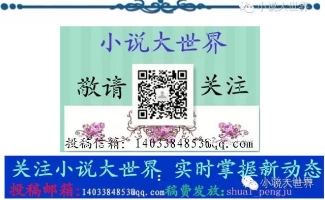 5、 投稿时请附带作者简介和近期生活照, 凡大作已被其他微信公众平台发布过的作品,请勿再投《 文学百花园》及《小说大世界》 谢谢支持。