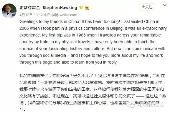 霍金在微博中写道:“我的中国朋友们,你们好吗?好久不见了!我上次拜访中国是在2006年,当时在北京参加了一场物理会议,那次经历非常难忘。我的首次中国之旅是在1985年,我那时候坐火车游历了你们雄伟的国度。这些旅行使我对博大精深的中国历史和文化略有了接触。不过现在,我可以通过社交媒体和你们交流了 —— 通过这个微博,我希望和你们分享我的生活趣事和工作心得,也希望能在互动中向你们学习。”