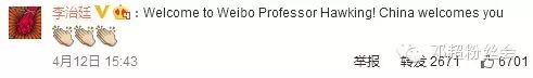 | 李治廷欢迎霍金微博截图 |