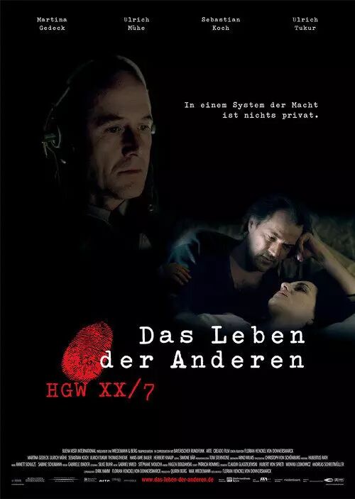 得到老同事古比兹Grubitz(乌尔里希·土库尔饰演,他总是流露出一种残忍的温厚)的支持,这个文化部的最高长官,以及前史塔西军官调动大臣赫姆夫Hempf(Thomas Thieme饰演),维斯勒就在德莱曼的公寓里安装了电线。
