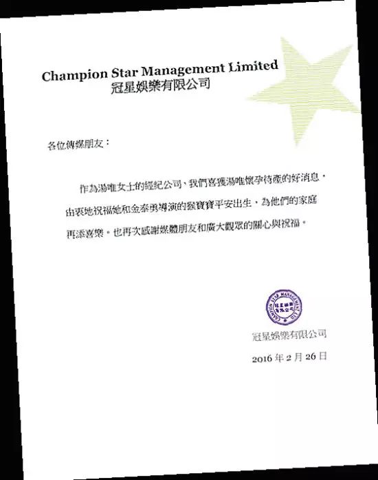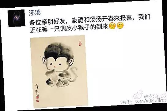 昨日,女神汤唯公布了怀孕的喜讯,称“泰勇和汤汤开春来报喜,我们正在等一只调皮小猴子的到来”。