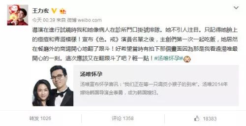 而今日凌晨,曾与她在《色戒》有过合作的王力宏发文恭喜。