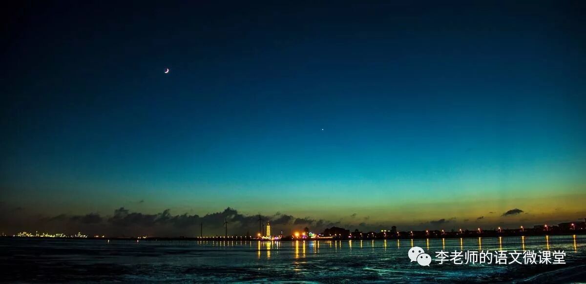 天空的霞光渐渐地淡下去了,深红的颜色变成了绯红,绯红又变成浅红。最后,当这一切红光都消失了的时候,那突然显得高而远了的天空,则呈现出一片肃穆的神色。最早出现的启明星,在这蓝色的天幕上闪烁起来了。它是那么大,那么亮,整个广漠的天幕上只有它在那里放射着令人注目的光辉,活象一盏悬挂在高空的明灯。