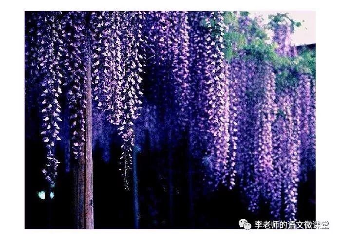 从未见过开得这样盛的藤萝,只见一片辉煌的淡紫色,像一条瀑布,从空中垂下,不见其发端,也不见其终极,只是深深浅浅的紫,仿佛在流动,在欢笑,在不停地生长。紫色的大条幅上,泛着点点银光,就像迸溅的水花。仔细看时,才知那是每一朵紫花中最浅谈的部分,在和阳光互相挑逗。