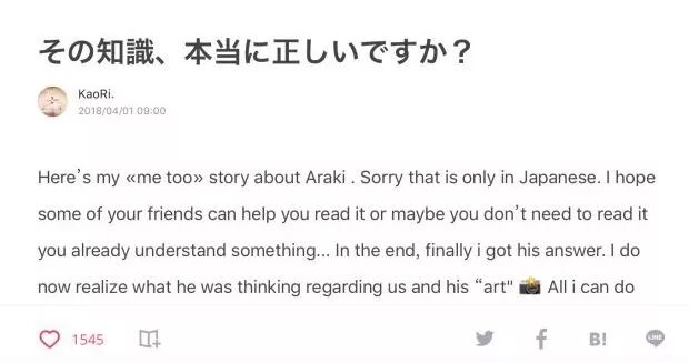 近日,模特 KaoRi(纯子)在网上发文,控诉了在与摄影大师荒木经惟合作的16年里,对她的压榨和操纵。