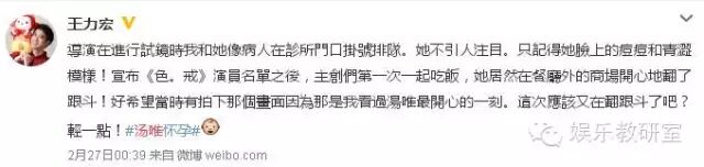 汤唯经纪公司的老板江志强在得知汤唯怀孕的消息之后,在朋友圈发了一段话,把汤唯感动得瞬时落泪。“我一辈子没写过朋友圈,专门为汤唯写了一条。”