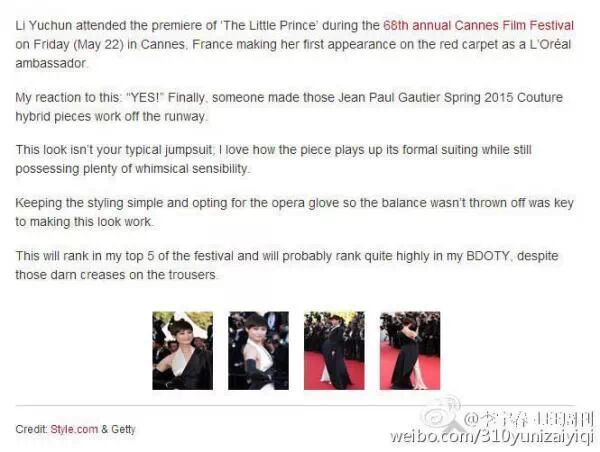 法国当地时间5月22日晚,李宇春以欧莱雅代言人身份受邀出席电影《小王子》首映礼。走红毯时,她秀出的是Jean Paul