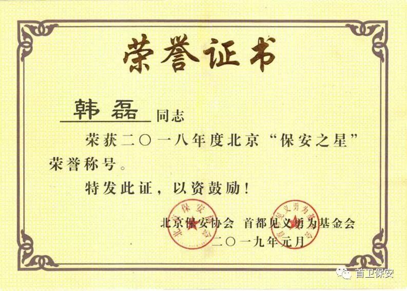 经北京保安协会、首都见义勇为基金会批准,首卫公司驻北京公交集团第四客运分公司375路队长韩磊,荣获二0一八年度北京“保安之星”荣誉称号。