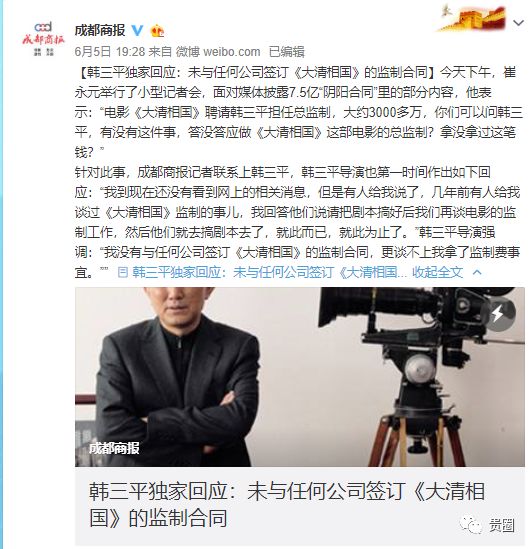 4日,他披露一对演员夫妇签下7.5亿人民币的“阴阳合同”,引发舆论猜测。5日,他将矛头直指杨子黄圣依夫妇,直言这对“7.5亿夫妇”曾经花3000万让韩三平做监制,但影片连剧本都没有。