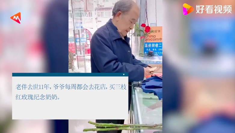 安徽合肥一位花店店主连续两年记录下一位老人为去世妻子买玫瑰花场景,老人老伴09年去世,如今每个星期,他都会来买玫瑰放在老伴照片前。店主:我花店开了5年,他每次都买3支红玫瑰。