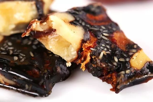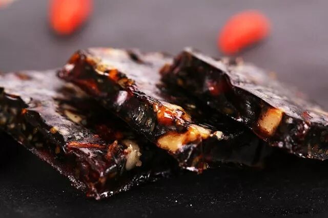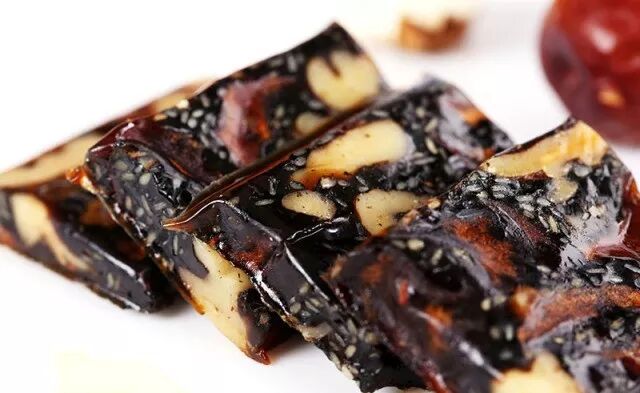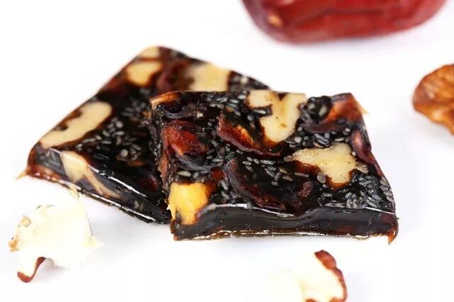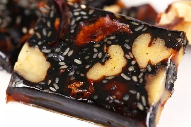 除阿胶外,从阿胶糕上可以清晰地看出红枣、大块核桃和黑芝麻粒,都是对身体非常有益的进补食材。