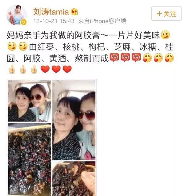 早在13年,国民媳妇刘涛就在微博晒出妈妈亲手熬制的阿胶糕。