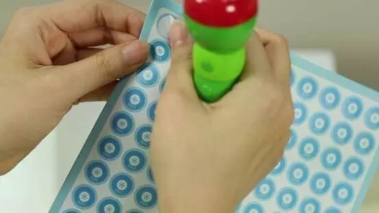 ● 拿出录音贴,毛毛虫点读笔。长按电源键3-5秒,开启毛毛虫点读笔