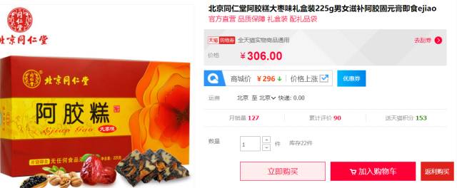 咱们这次开团的北京同仁堂阿胶糕,原价306元,团购价格186元,全国包邮。对比某猫的价格,简直不能再亲民。