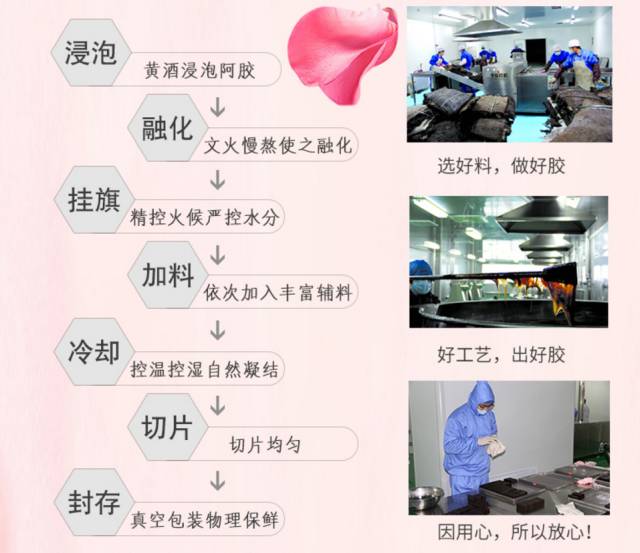 阿胶会先用黄酒浸泡后,再用文火慢慢熬(这样可以去除腥味,闻起来有淡淡的清香),在熬制过程中严格控制火候和水分。