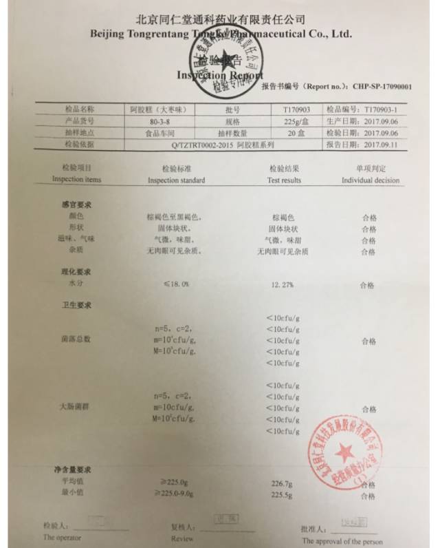 同仁堂阿胶糕里没有任何食品添加剂,这是检测报告: