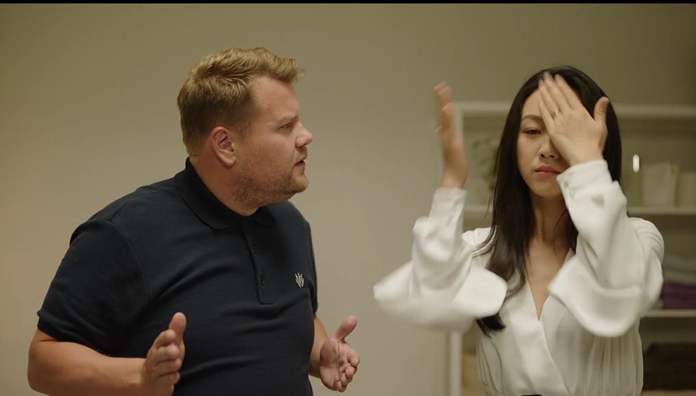 和英国著名的搞笑艺人詹小胖James Corden搭档的汤唯,在视频里开心地玩玩闹闹,作出各种搞怪的表情和姿势为神仙水代言,丝毫不拘束。