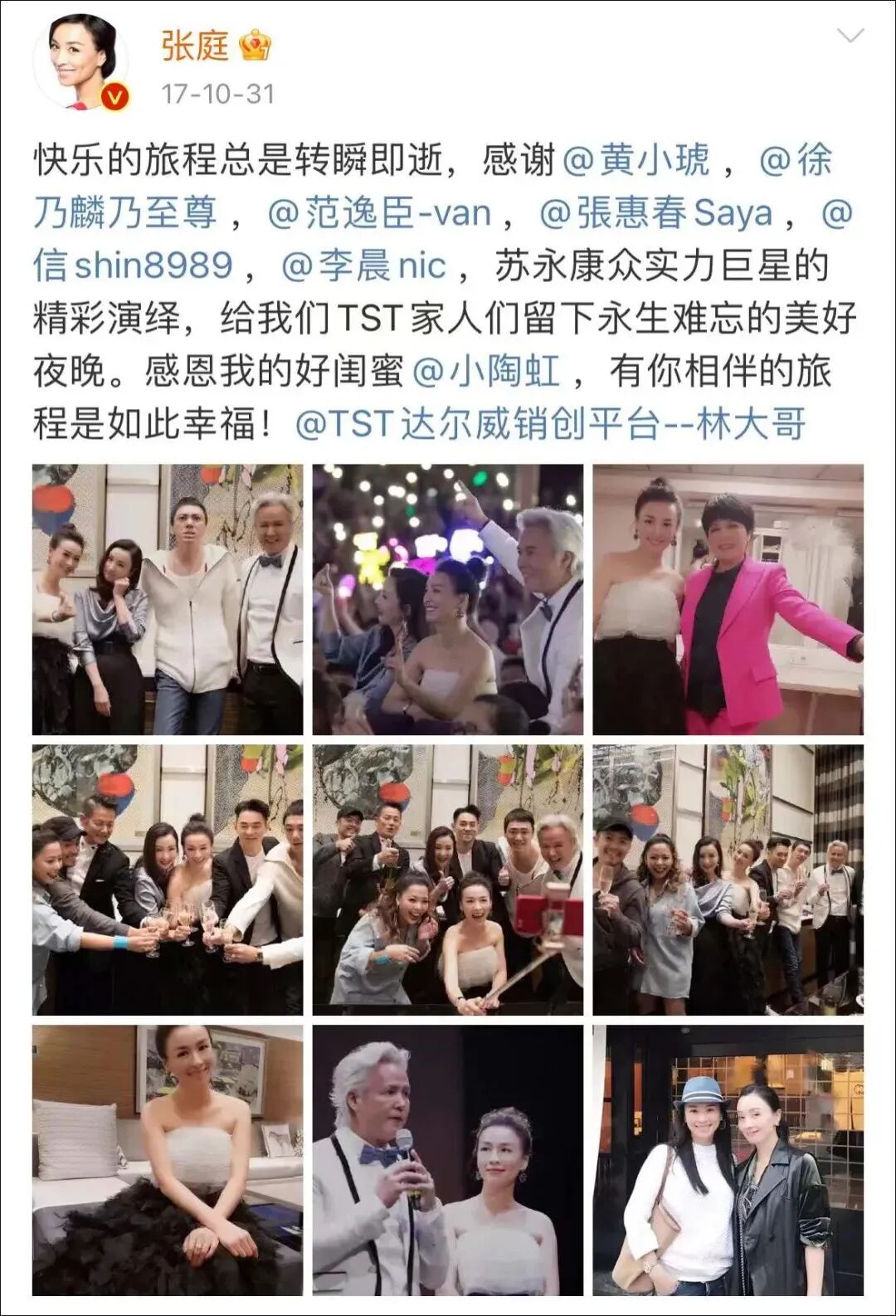 不只陶虹,黄小琥、徐乃麟、范逸臣、张惠春、信、李晨、苏永康也曾在2017年被张庭纳入自己的展示栏,而微博上所谓的“我们TST家人”,正是日后深受困扰的投诉者、受害者。