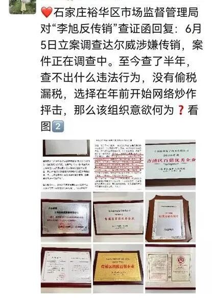 与此同时,达尔威公司的成绩噌噌直上,2018年的营收直接突破80亿元,纳税约21亿元,成为当年上海市青浦区纳税额最高的公司,在代理商辟谣传销的朋友圈截图中,荣誉奖牌一个挨一个。