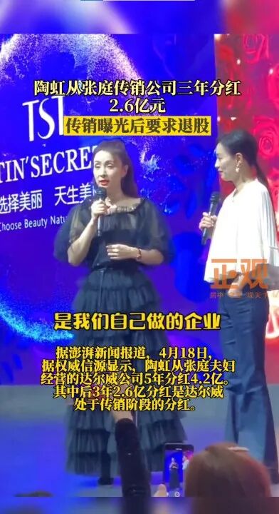 4月20日,张庭的好友陶虹被爆出从张庭夫妇经营的公司中获得分红2.68亿元。据澎湃新闻消息,陶虹目前已要求从公司退股。
