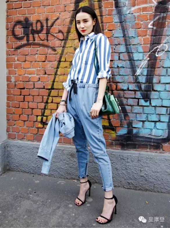 小宋佳这件蓝白粗条纹衬衫搭配系带牛仔裤,难掩的Chic混搭感,衬衫扣可以只系两三颗,这种美式休闲味道的穿法经典实用。
