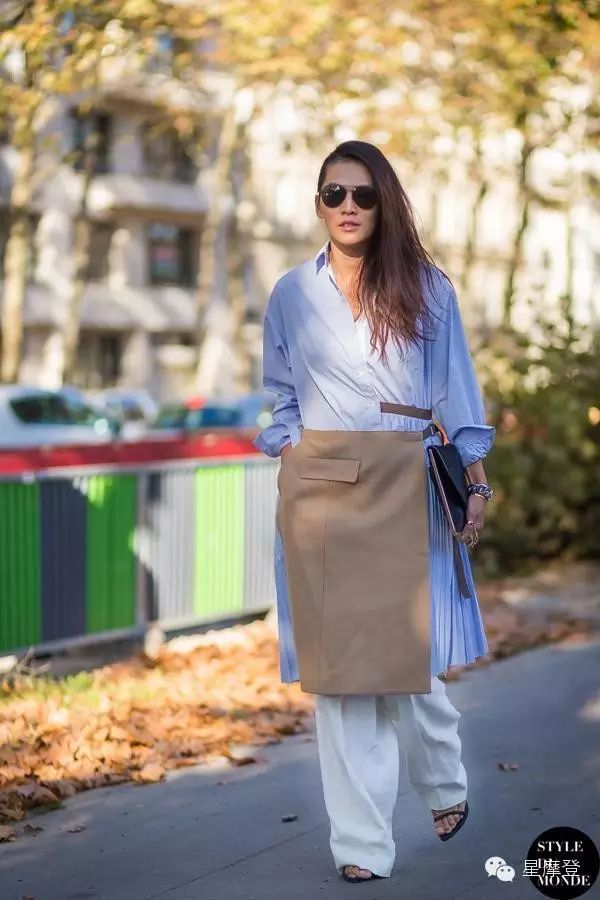包臀裙里面露出超长的蓝衬衫裙摆,这个独特的时尚搭配很值得尝试哦~