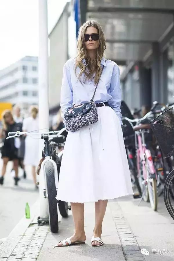 超模卡洛琳·布拉什·内尔森蓝衬衫配白裙看着就十分轻松潇洒!