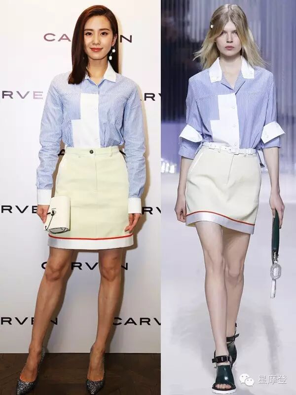 刘诗诗一件Carven蓝白条纹衬衫搭配鹅黄色裹身裙,甜美中带着文艺清新的味道,领口和袖口的白色拼接也让蓝白条纹衬衫与众不同。