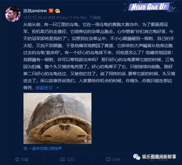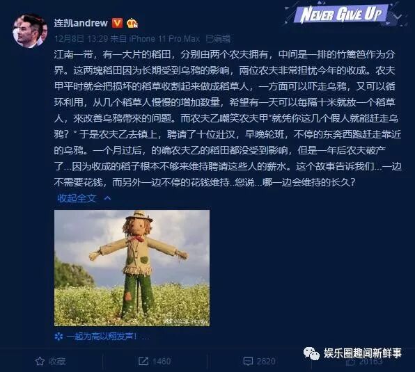 12月8日,高以翔生前的好友连凯再度发文,虽然没有指名道姓,但文中的内容,网友们都能读懂其中意思。一传一,十传百,百传千,千传万,告诉所有的人,真相还未揭露之前,不看浙江卫视。也许是迫于压力,连凯把内容写得很隐晦。不止是这一条,同样是昨日,连凯用一个农夫和稻草人的寓言故事,道尽追求真相的迫切。不仅如此,12月7日,12月6日,12月5日,连凯每一天都在为好友高以翔发文,只是为了不愿让他,不明不白地离开这人世间。