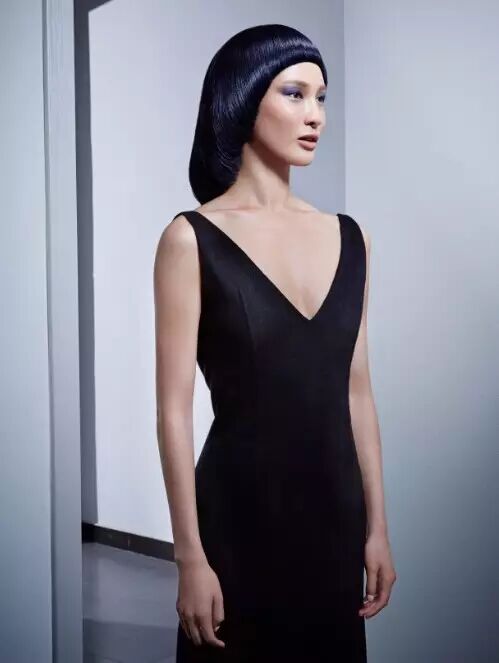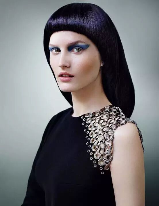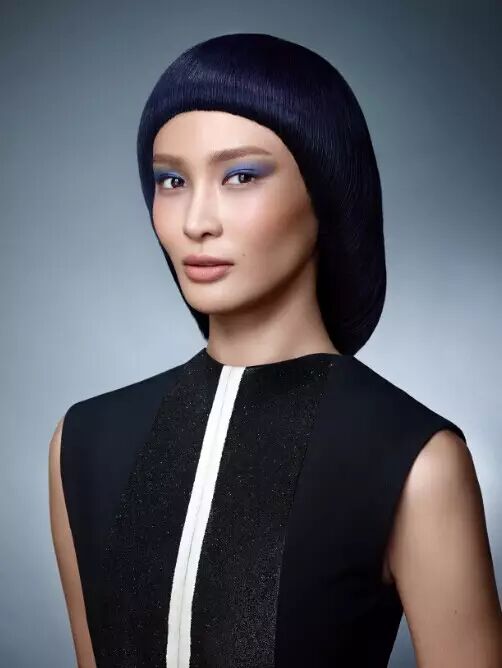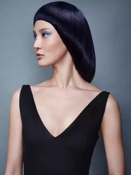 在黑色秀发的基础上进行蓝色或紫色挑染,交错呈现的色彩效果,更易于日常发型的打理。整体定型时可利用食指和中指,将决定廓形的发尾进行着重调整,修饰脸型的附加值不可小觑。